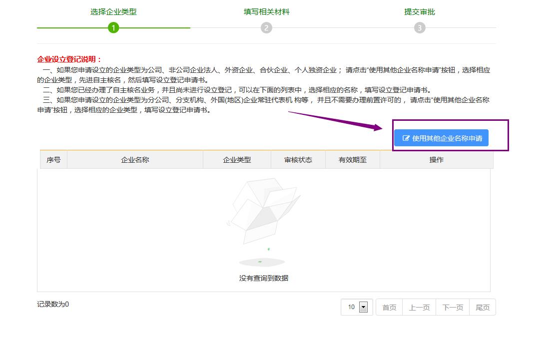 點擊“辦理”之后,跳轉到下面的界面,可以先閱讀一下企業設立登記說明;然后點擊頁面右上角“使用其他企業名稱申請”,如下圖:
