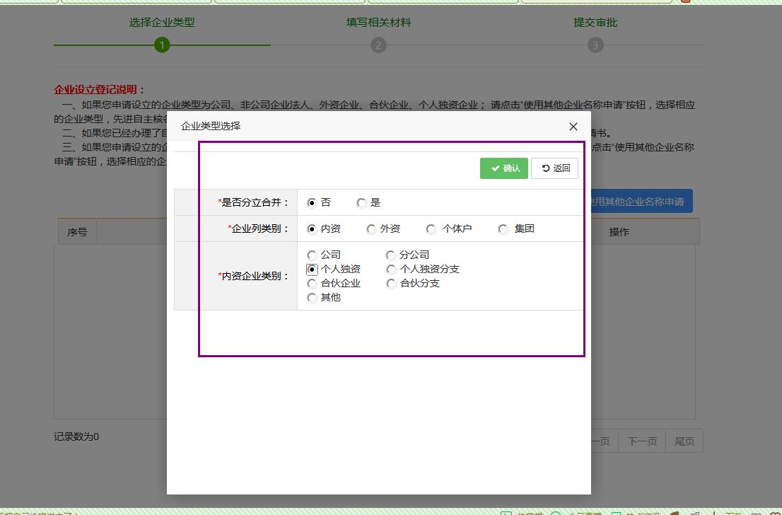 選擇之后會彈出一個“企業類型選擇”的彈窗;選擇好自己企業的類別,然后點擊確認:如下圖: