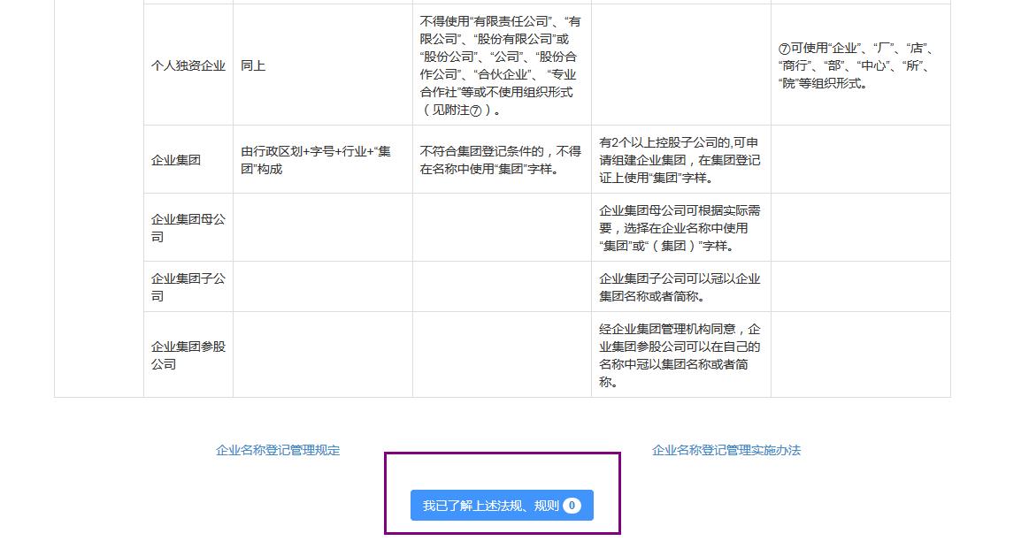 點擊確認之后,跳轉企業名稱自主申報規則頁面;一般都是一些關于公司名稱,公司成員,公司形式的要求,可以閱讀一下,也可以直接點擊最下面“我已了解上述法規,規則”(注意:系統會有一個21秒的閱讀時間,在這個時間內是無法點擊五一了解上述法則,法規,等待21秒過完即可)如下圖:
