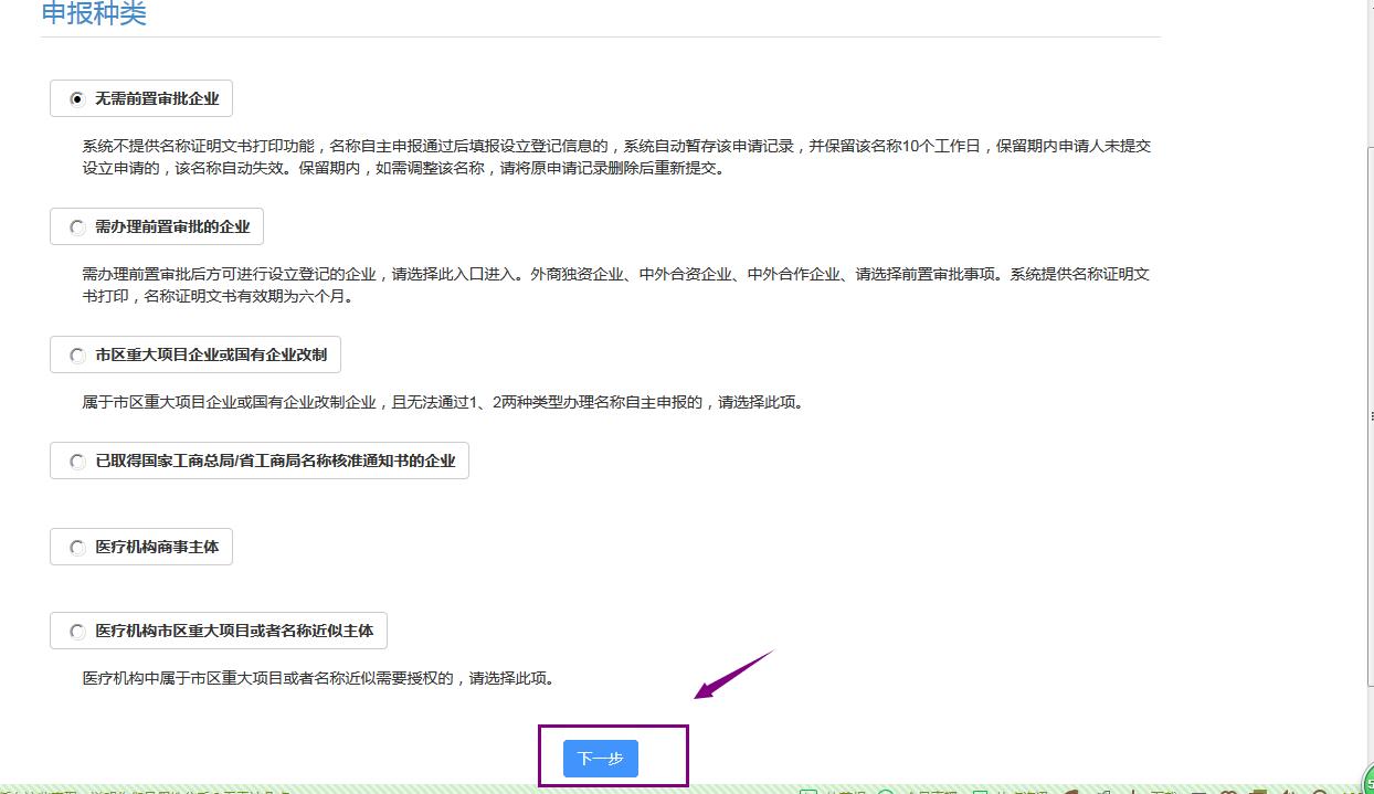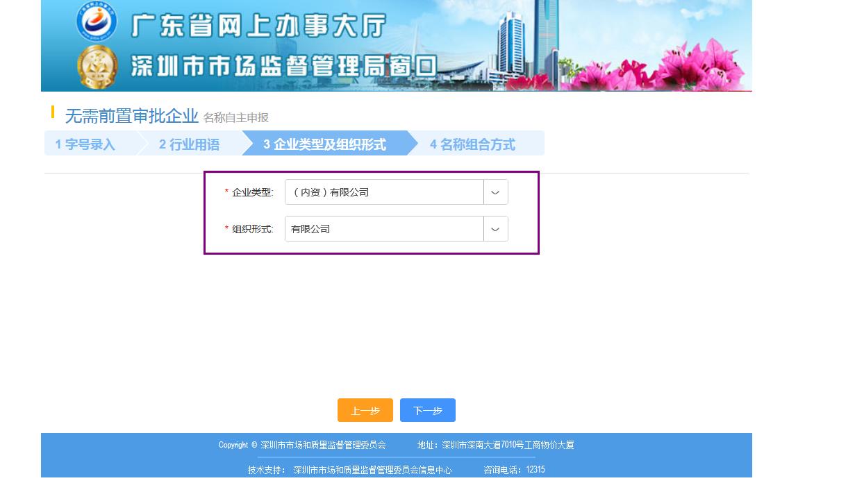 這里是核名第三步,選擇企業類型和企業組成形式,如下圖:
