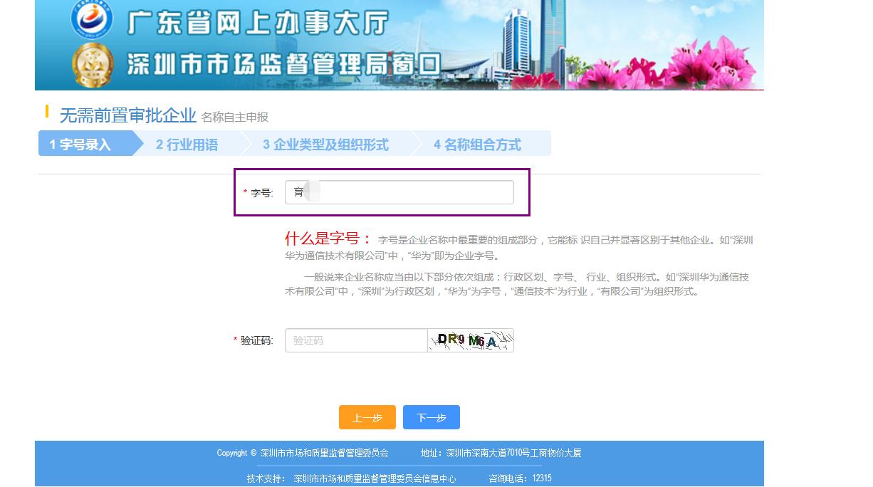 接下來是非常重要的一步,“公司核名”,將你準備好的公司名稱輸入你的字號就可以。無需輸入公司全稱。(注意,公司名稱的組成形式為:“深圳市”+“字號”+“行業”+“有限公司”)在輸入框只需要輸入你的公司字號就可以。然后輸入驗證碼,點擊下一步,如下圖