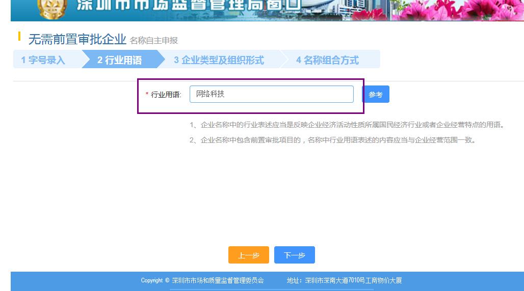 下面一步就是核名第二步,輸入行業進行查詢,點擊下一步,如下圖: