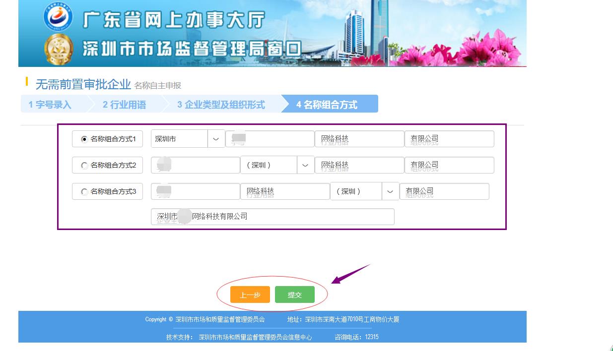 下一步該恭喜你一下,你的公司名稱是可以用的,你要選擇一下你比較滿意的名稱組合方式,系統會給你列出所有的公司名稱組合方式供你選擇,選擇好之后,點擊提交,如下圖: