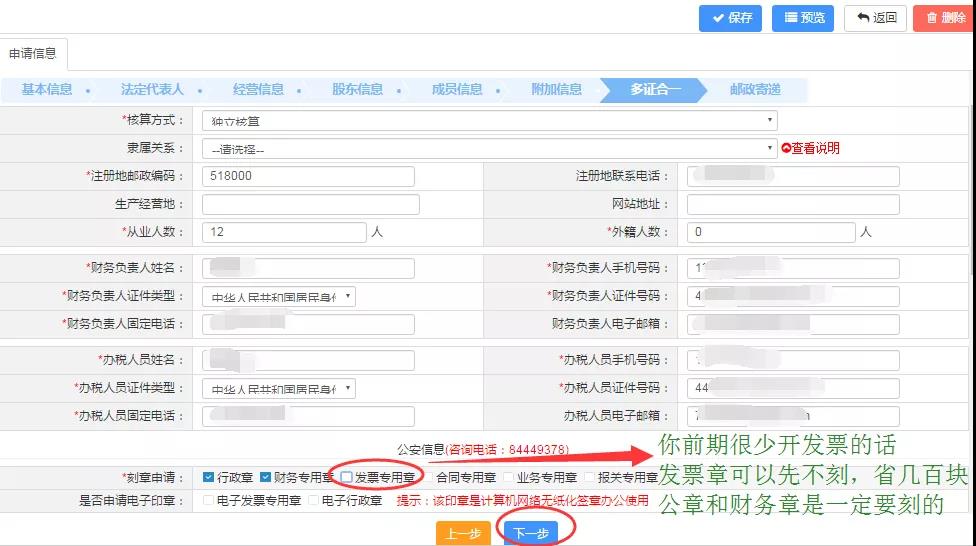 第十七步:填寫多證合一信息,適用會計制度填寫,一般民營的都是選擇“小企業會計準則”