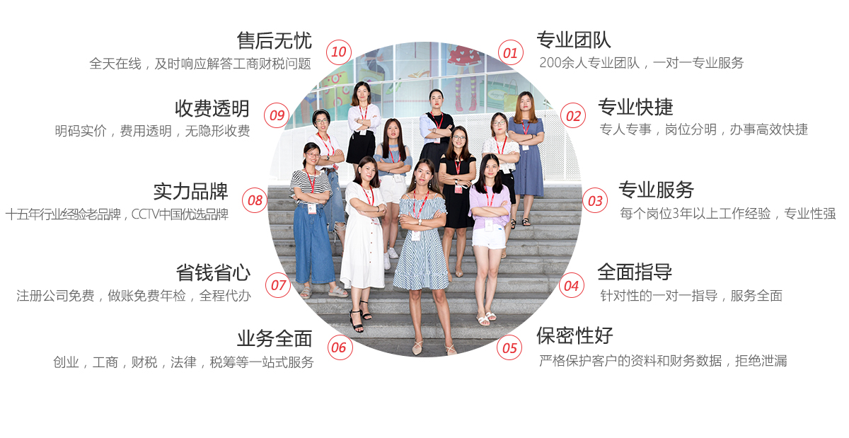 十五年行業經驗,于2017年榮獲工商財稅服務行業CCTV中國優選品牌,高端一對一服務!