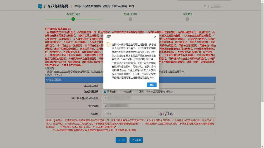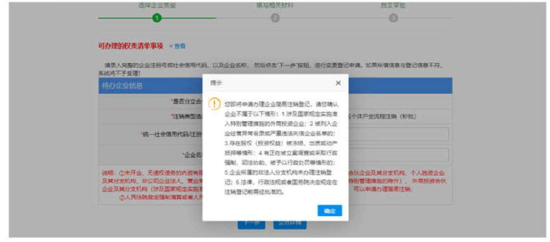 4、勾選選擇簡易注銷,輸入企業(yè)相關(guān)信息,點(diǎn)擊下一步進(jìn)入簡易注銷公告填報(bào)功能。