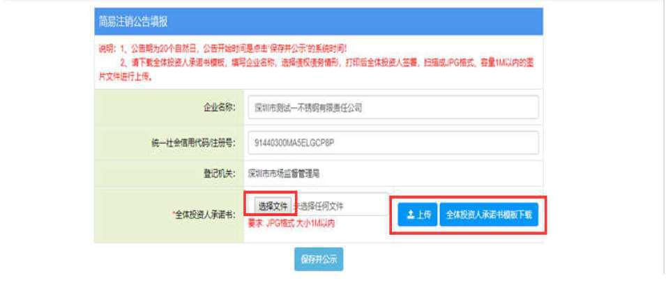 7、先下載承諾書,填寫好法人簽字加蓋公章,拍照或掃描,點(diǎn)擊選擇文件找到承諾書,然后上傳,保存并公示。